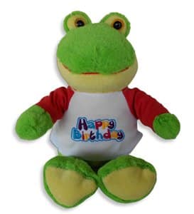 Say “Hello” to this green plush, big-eyed, friendly, adorable little froggie. He is here to make someone’s birthday, extra special. Wearing his “Happy Birthday” greeting, embroidered in multicolors on his white, with red sleeves T-shirt, he is sure to make a big hit with all!