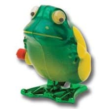 One of our cutest wind-ups in our collection of froggy wind-up toys: Here’s the action—Wind him up– He goes hippity-hop across the table—he stops halfway—his eyelids open—he actually winks at you before he resumes his hippity hopping again. Absolutely adorable and awesome action!