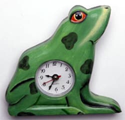 An adorable all wooden, all hand made, colorful frog, features a round battery operated clock, encased in front of its body. The frog is in a sitting position and would fit perfectly on a desk, shelf or table. This is a unique little frog clock indeed! ( batteries not included)