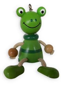 This adorable little frog with the friendliest of smiles has a wooden body with movable string arms and legs, ending in wooden beads. This gives the little froggie a marionette effect, allowing for pleasant dangling movements. It also has a large quality metal clip on top which will not only accommodate your keys, but will permit it to be hung from backpack, mirror, locker or any other place you can think of to show off this little froggie.
