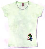 Tye-dyed 100% cotton light green ladies cap sleeve red eyed tree frog t-shirt. He is clinging on to you and not letting go! She will love this cute t-shirt.